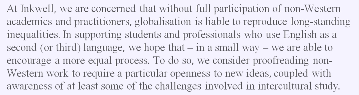 However, while proofreading can transform your work, there are also drawbacks, especially where complex or new ideas are involved. If your proofreader is not extremely careful, it is easy to change the meaning of your work, misinterpret phrases and even alter your whole argument through very slight changes. These can be very difficult to notice however good your English, so it is important to use only good quality professionals. At Inkwell, as well as reading work extremely thoroughly, we indicate any point where there