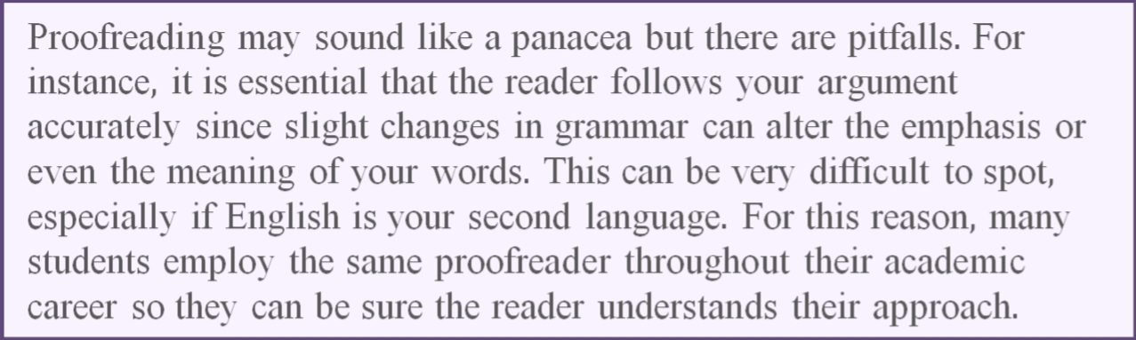 In particular, if English is not your first language, having feedback and help with expressing your ideas can ensure that your work reflects your intellectual abilities rather than your use of English. For more information about this, see our ‘English as a Second Language’ page.